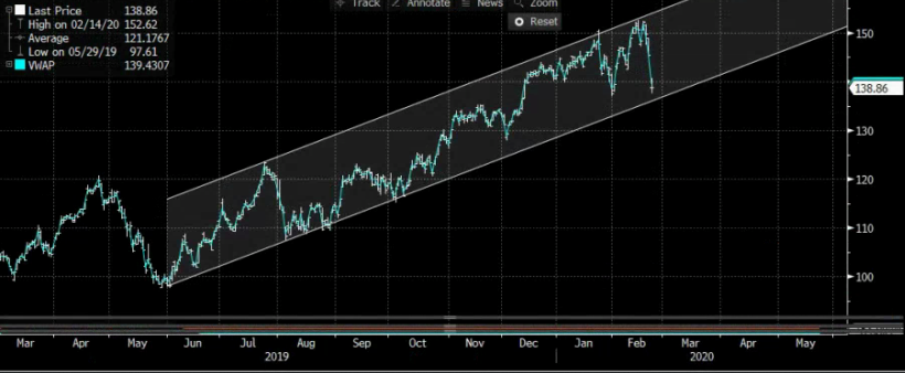 So where am I looking if the selloff is not part of a larger global economic slowdown, or the start of the end of the world, i mean how do you really hedge that, then the place I would look to put money back to work is the semiconductor Index. The uptrend is still intact, and they have been hit the hardest due to the shut down concerns. However if this just turns out to be a temporary slowdown and if I had some cash on the sidelines, it might be an interesting place to own. I think you can keep a tight stop on around $132 mark in SMH or use some call options to define risk and get upside exposure. I also think value investing makes sense as well if you own it with the Semiconductors because the Semis will provide enough an upside volatile move if today’s sell off is a one-day price correction.