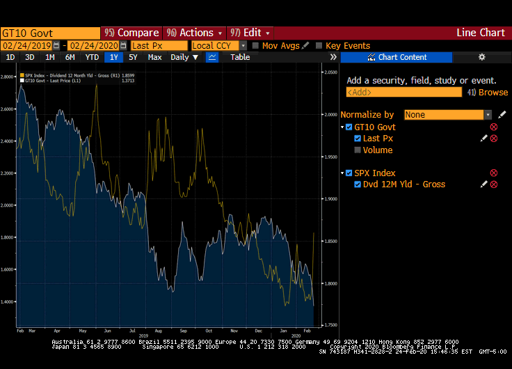 The recent drop in interest rates in the bond market has pushed the indicative dividend yield on the S&P 500 to a 60 bps premium to the 10 year bond yield. If you factor in that dividends have a lower tax bracket potentially, the yield difference is even greater.