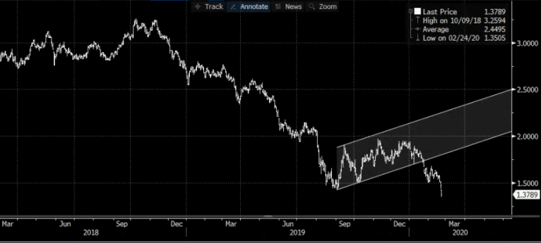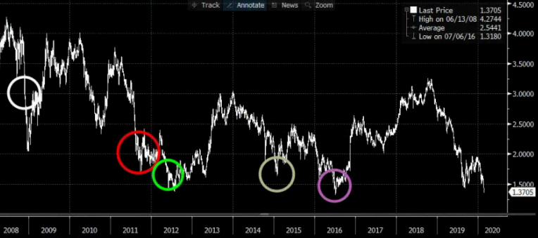 Part of the catch 22 recently has been that bonds have been rallying as if to say that economic growth is slowing dramatically, and stocks have surged to 2007 level forward P/E numbers suggesting that the economy is heating up. Interestingly the data domestically in 2020 has been quite good so it seemed as if rates should not be going lower. Yet they are, and historically whenever they have been this stretched out its been the end of a selloff, even if this selloff is not as dramatic as recent ones.
